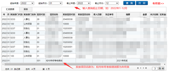 在上述界面,可以看到查询期间2022年1-12月内发放的所有其他收入,其中已包含:校内年终考核绩效即年终奖。上图所展示的2022年1月发放的年终奖即为2021年度年终奖。教职工还可点击上图中右上角红色“年终奖”按钮,进行单独的年终奖收入查询。