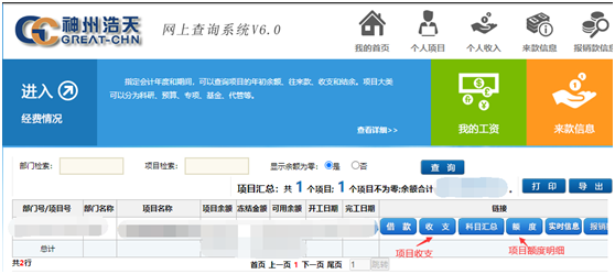 项目在财务处立项后,即可在网上查询系统进行展示。进入网上查询系统后,即可看到自己的全部项目。若查询项目的收入和支出情况,请点击下图所示的“收支”按钮,若该项目下有额度控制,教职工需要查看具体的额度明细,请点击下图所示的“额度”按钮。